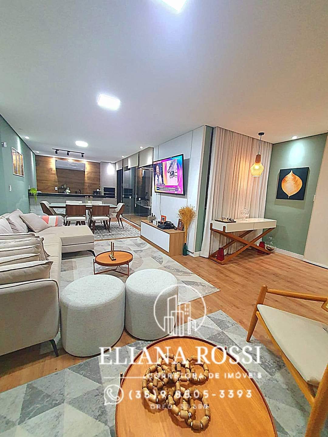 sala imensa tv conjugada a sala jantar e área churrasqueira